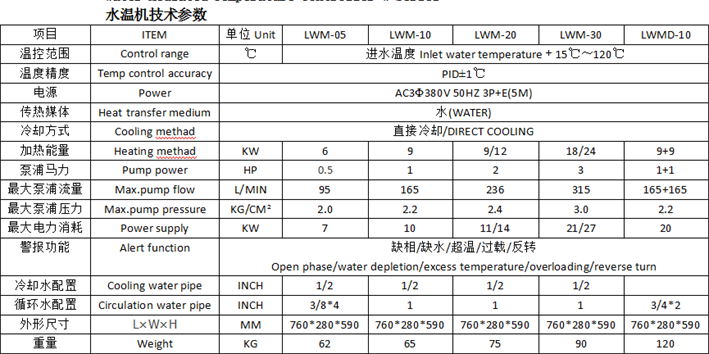 水循环模温机,小型水温机,模温机设有多项安全保护设置,温度异常时,循环温度超过上限值警报并切断主电源,接触器卡死异常加热报警并指示,系统压力异常自动停止加热动作,BY-PASS泄压回路保护泵浦,液位开关检测水位防止缺水并报警指示,安全保护完善故障显示,维修保养无须专业人员.小型水温机在选购时,尽量提供详细的工艺情况,由小型水温机为您确定机型,根据实际生产工艺来确定加热功率及泵浦功率,避免产生因机型不对而无法正常使用的情况出现.