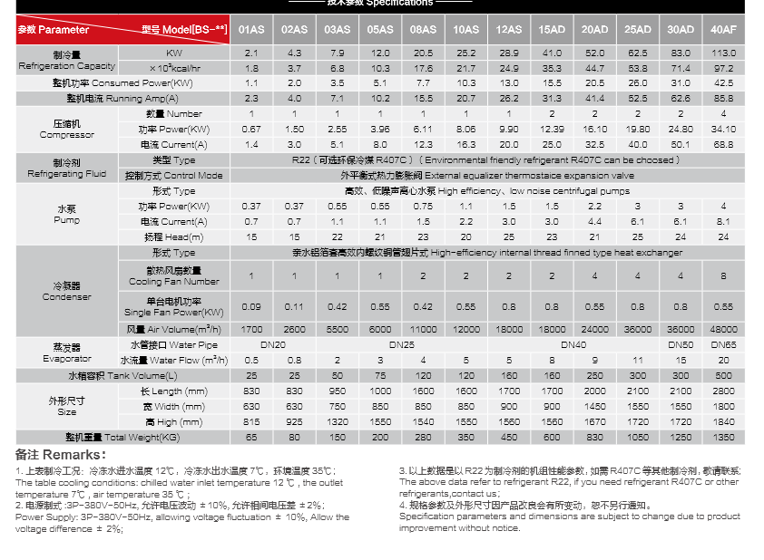 BS系列-冷水机:风冷式冷水机,水冷式冷水机,低温冷水机等制冷设备。风冷式冷水机:在它机身内含有保温水箱和水泵,无需再另加冷却水塔来散热,安装和移动非常方便,但是它对工作环境要求较高,因为它是以热风循环来制冷的,如果安装车间的通风效果不好的话,会直接影响到制冷效果。水冷式冷水机:制冷量大,但需要另外加装冷却水塔,才能达到好的冷却效果。水冷冷水机组通过水来进行冷却作用的制冷设备,通过冷却塔来消耗机组自身所产生的热量,冷冻水则是通过机组蒸发器来完成的,冷却塔提供的水源主要是在冷凝器中进行热交换。
